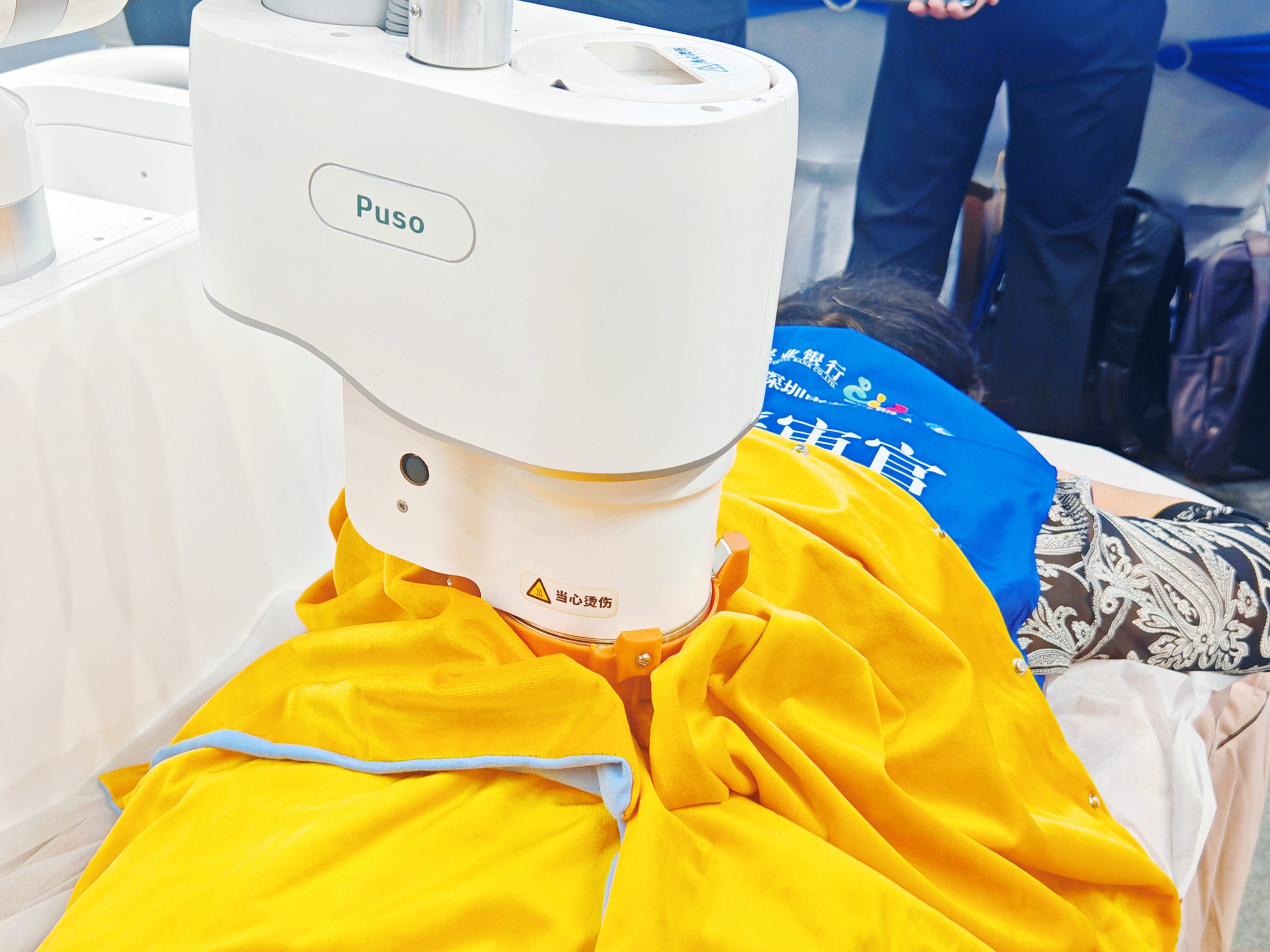 大赛最大的创新之处在于打破传统科技赛事评审模式,由深圳市长青老龄大学组织推荐 120 余名乐龄体验官,联合50家投融资机构共同组建评审团队,让老年人真正成为康养产品的评判者。在朴硕生命科技的展区,乐龄体验官们纷纷上前亲身体验全自动智能艾灸机器人。该机器人具备智能定穴、精准控温、自动调节艾灸距离等功能,无需人工过多操作,只需根据自身需求设定参数,即可享受舒适、安全的艾灸服务。